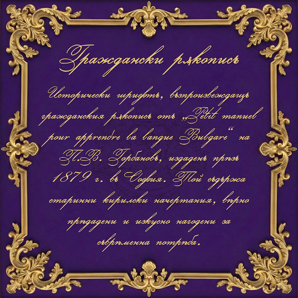 “Civil Manuscript” (original name: „Граждански рѫкописъ“) is a historical Cyrillic font inspired by late 19th-century Bulgarian typography and orthography. It is based on the 1879 work “Petit manuel pour apprendre la langue Bulgare” by P. V. Gorbanoff, published in Sofia.